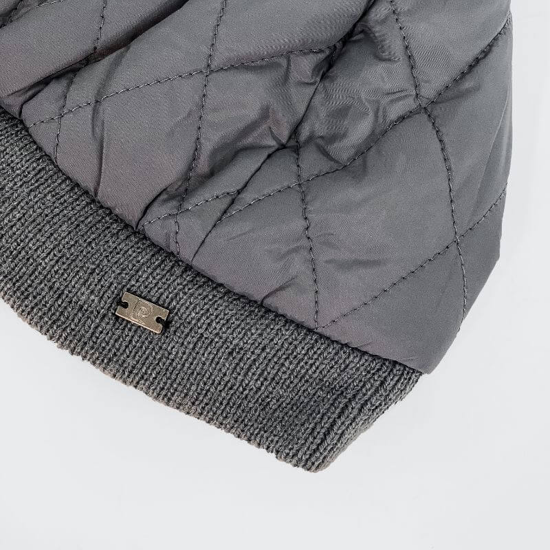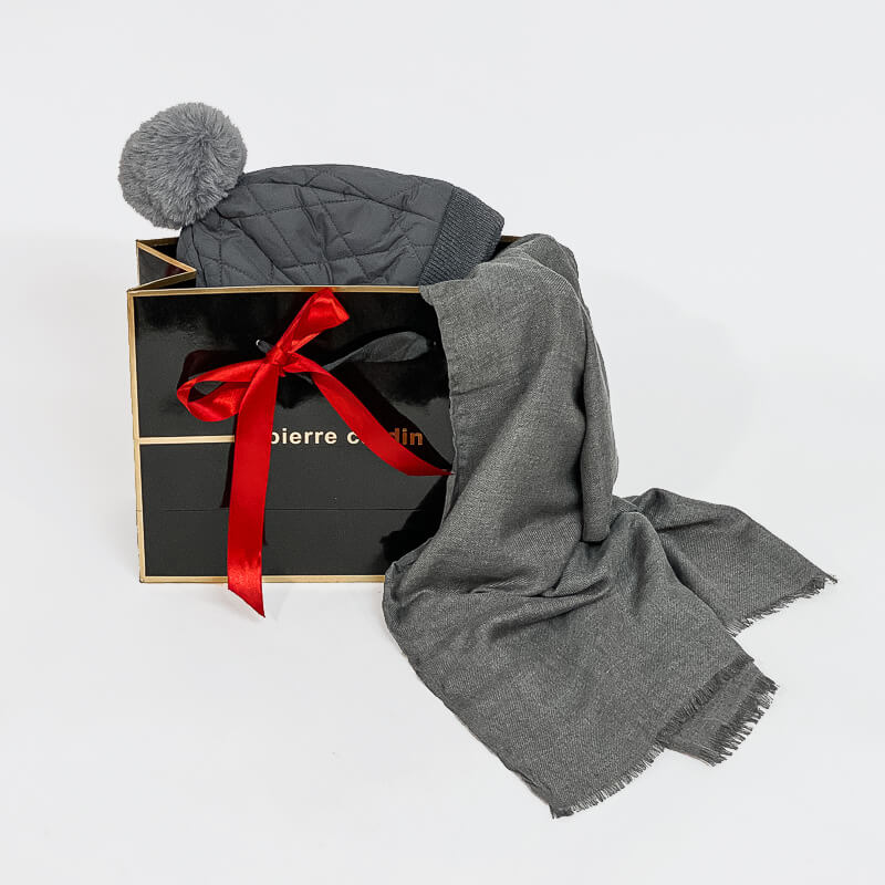 Γυναικείο σετ δώρου Pierre Cardin που περιλαμβάνει σκουφάκι με γουνάκι και καπιτονέ σχέδιο σε γκρι χρώμα που έχει βαμβακερή εσωτερική επένδυση για να κρατάει το κεφάλι σας ζεστό και μία απαλή πασμίνα.