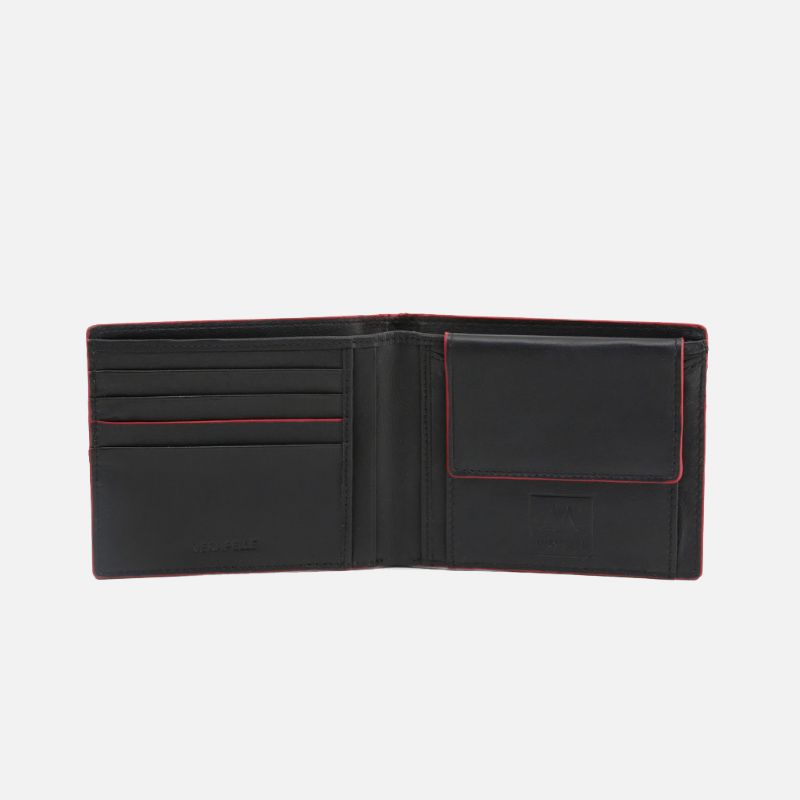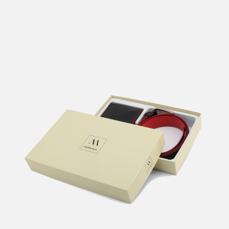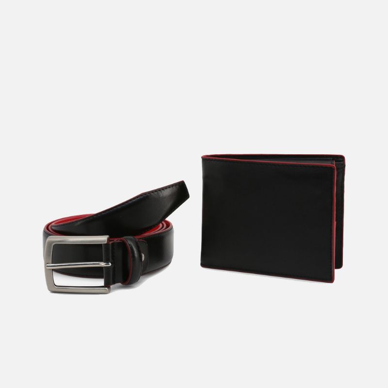 Σετ δώρου πορτοφόλι και ζώνη Made In Italy σε μαύρο χρώμα με κόκκινες λεπτομέρειες.