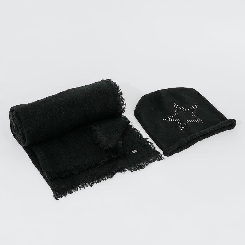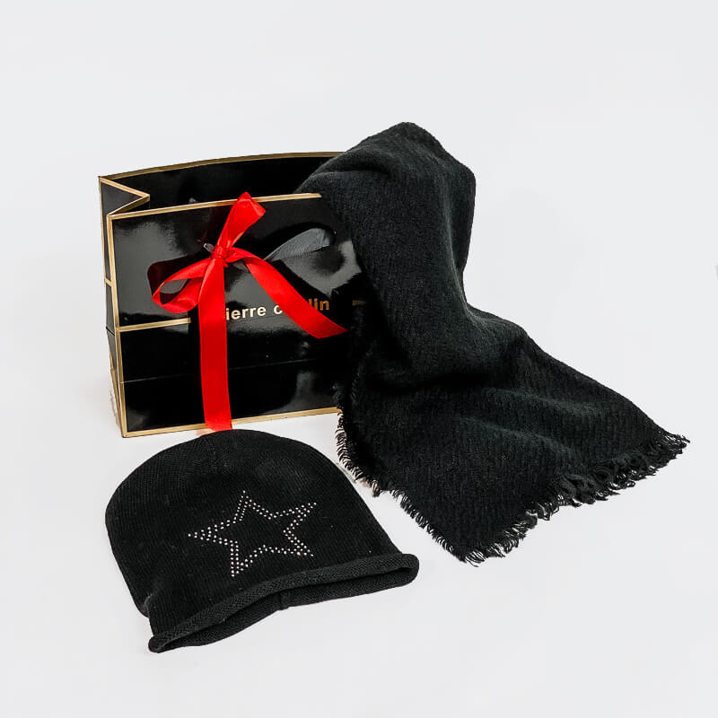 Σετ δώρου Pierre Cardin που περιλαμβάνει σκουφάκι με απαλή υφή και στρας σε σχήμα αστεριού και κασκόλ.