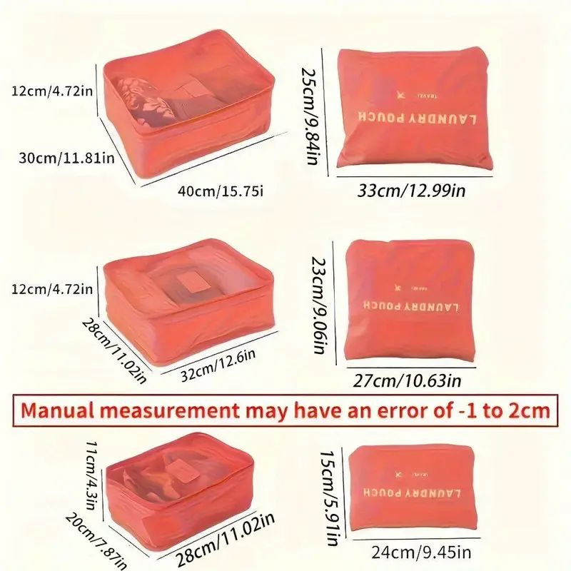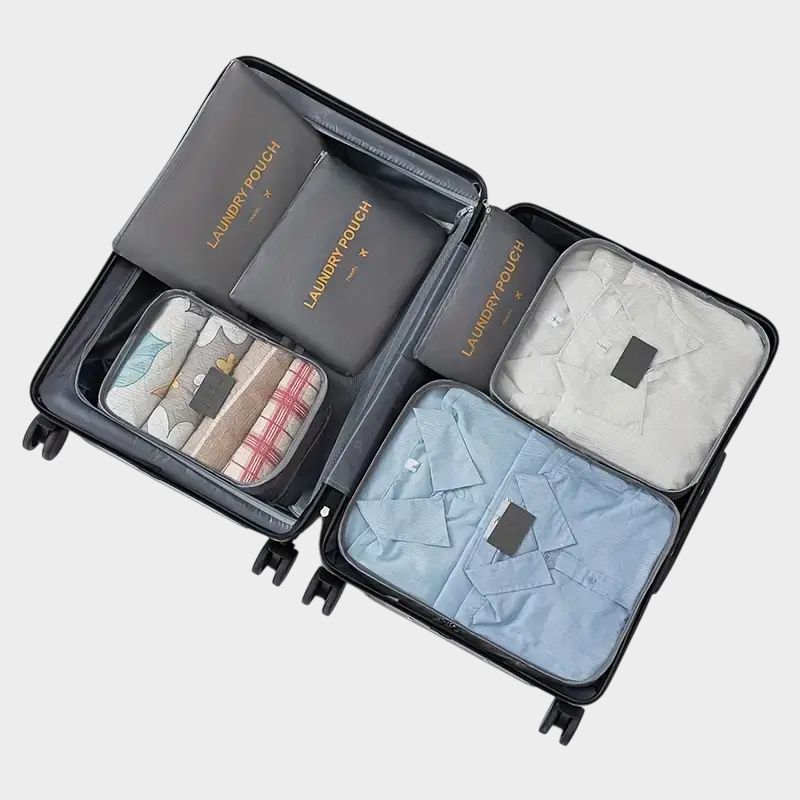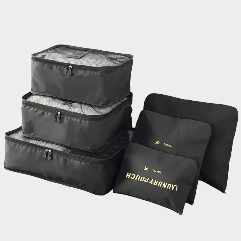 Έξι αδιάβροχες τσάντες αποθήκευσης ιδανικές για την οργάνωση των ρούχων σας και των άπλυτων ενώ ταξιδεύετε. Περιλαμβάνονται: