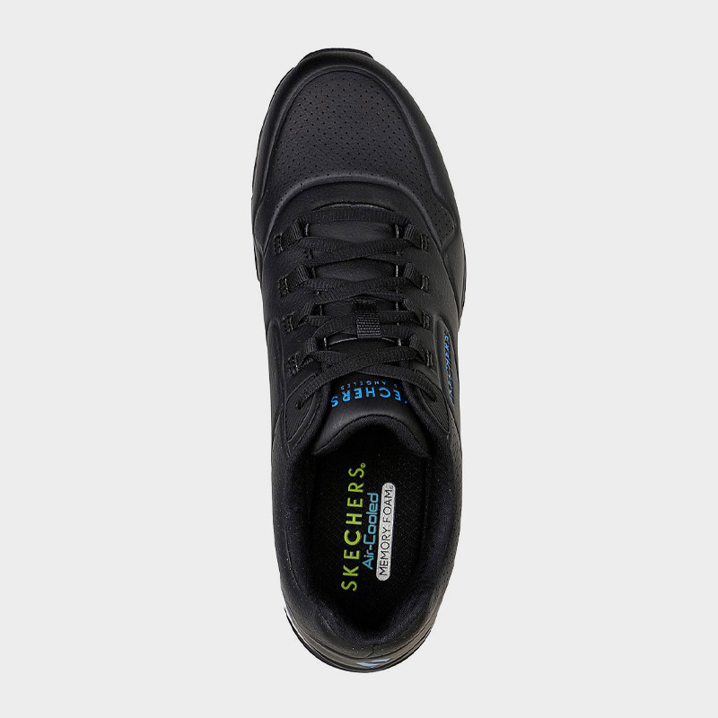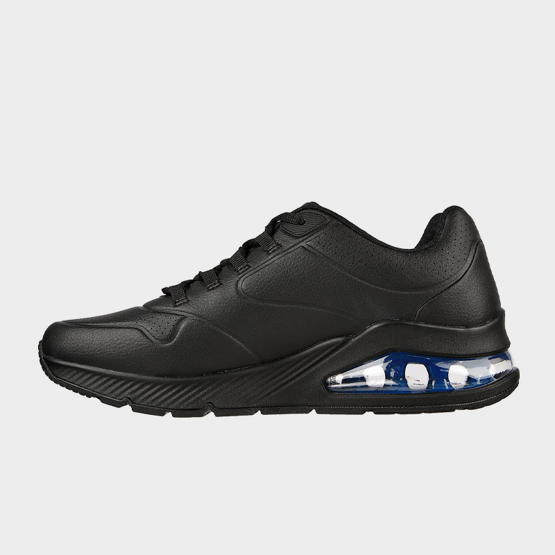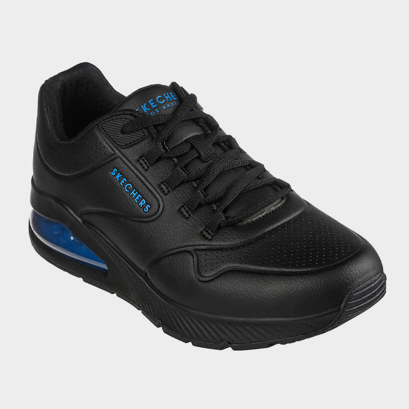 Sneaker της Skechers με άνω μέρος από διάτρητο, οικολογικό δέρμα σε μαύρο χρώμα με μπλε λεπτομέρειες. Διαθέτει μαλακό εσωτερικό πάτο Skechers Air-Cooled Memory Foam και ορατή αερόσολα για αντικραδασμική δράση και μεγαλύτερη άνεση. Ένα παπούτσι που θα σας χαρίσει άνεση και στιλ στην καθημερινότητα σας.