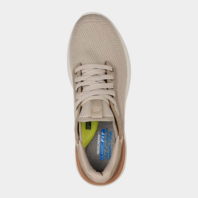 Sneaker Skechers με άνω μέρος από διαπνέον ύφασμα υψηλής ποιότητας σε μπεζ χρώμα. Διαθέτει μαλακό εσωτερικό πάτο Air-Cooled Memory Foam® για αντικραδασμική δράση και Skechers Goga Mat Arch™ για πρόσθετη υποστήριξη. Ένα άνετο και κομψό παπούτσι κατάλληλο για κάθε μέρα.