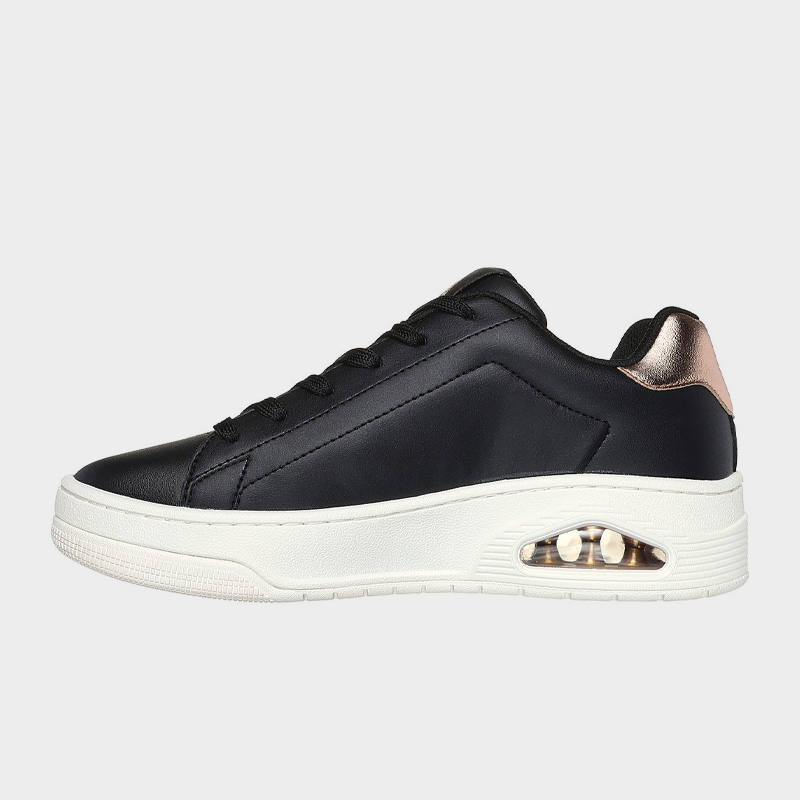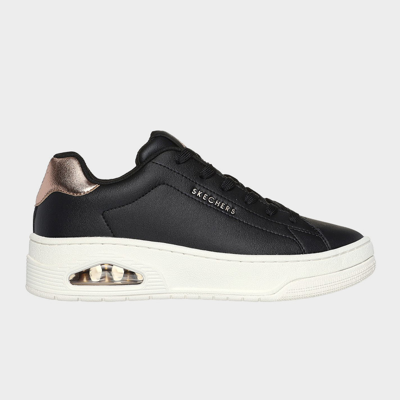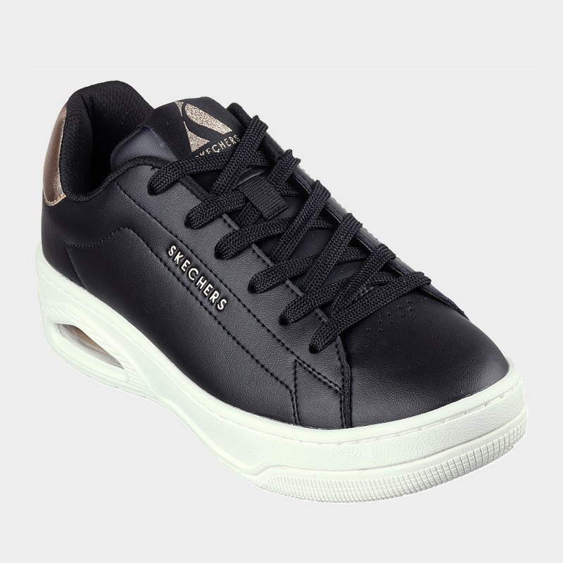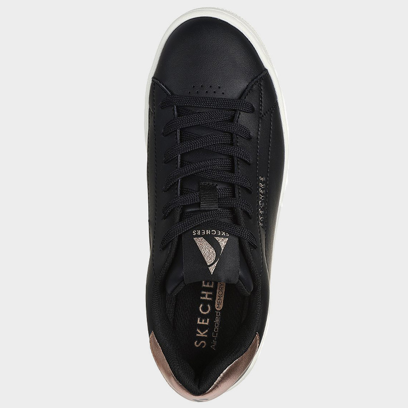 Sneaker της Skechers με άνω μέρος από οικολογικό δέρμα σε μαύρο χρώμα με μπρονζέ λεπτομέρειες. Διαθέτει μαλακό εσωτερικό πάτο Skechers Air-Cooled Memory Foam® και ορατή αερόσολα Skech-Air®. Ένα casual παπούτσι για άνεση και στυλ.