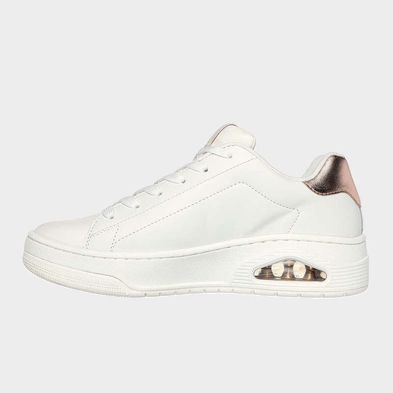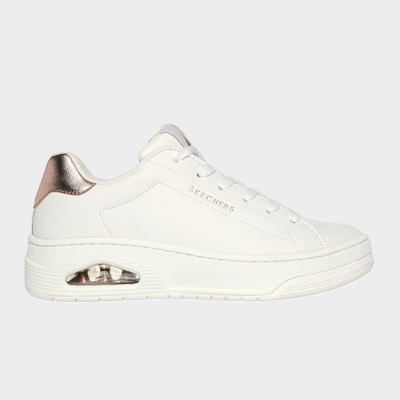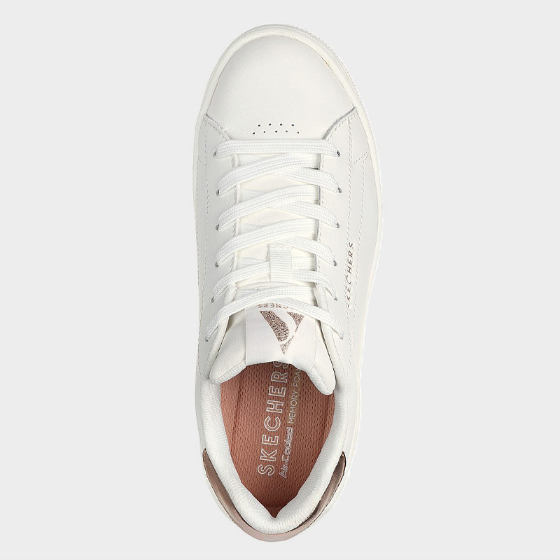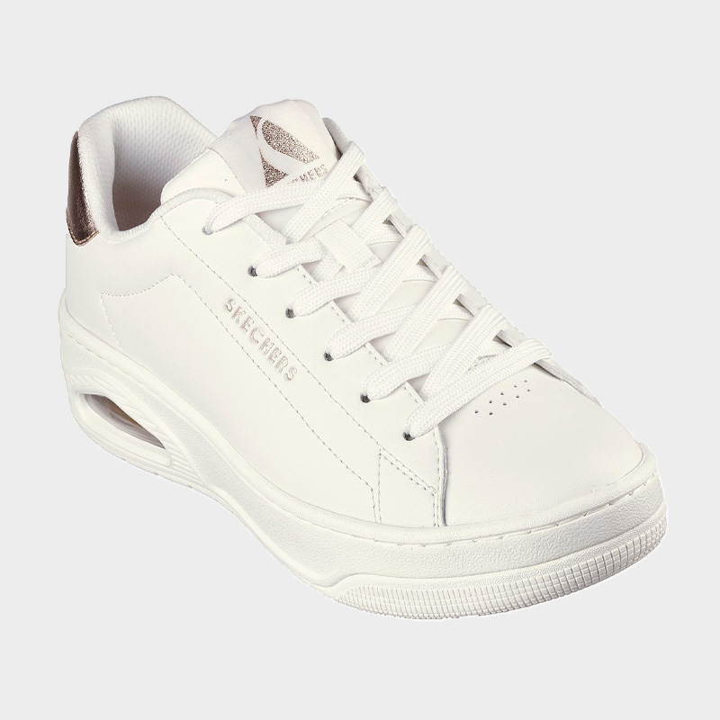 Sneaker της Skechers με άνω μέρος από οικολογικό δέρμα σε άσπρο χρώμα με μπρονζέ λεπτομέρειες. Διαθέτει μαλακό εσωτερικό πάτο Skechers Air-Cooled Memory Foam® και ορατή αερόσολα Skech-Air®. Ένα casual παπούτσι για άνεση και στυλ.
