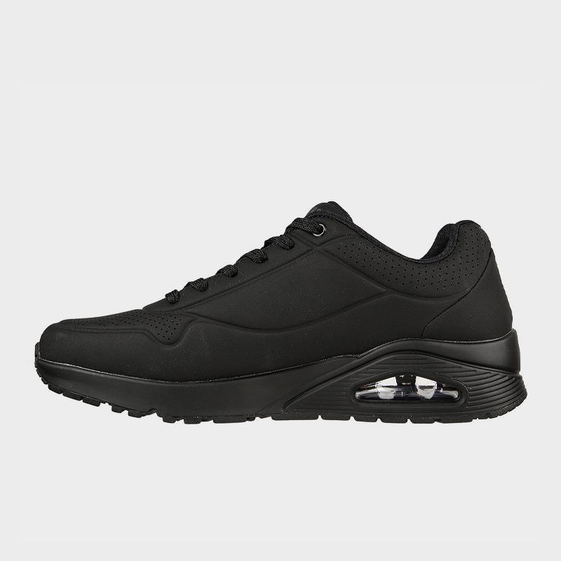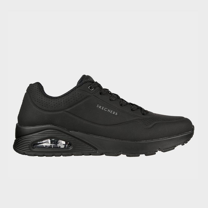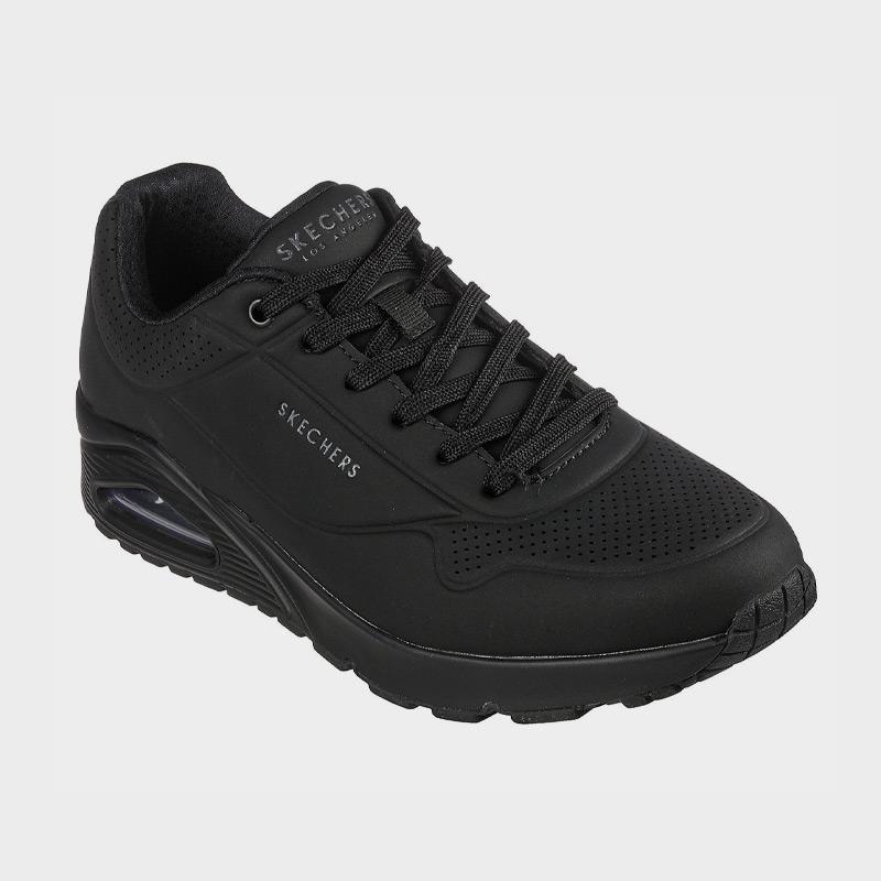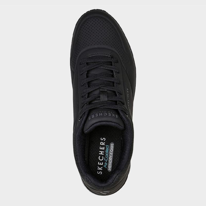 Sneaker της Skechers με άνω μέρος από οικολογικό δέρμα σε μαύρο χρώμα. Διαθέτει μαλακό εσωτερικό πάτο Air Cooled Memory Foam και αντιολισθητική Air Cushioned σόλα. Ένα casual παπούτσι κατάλληλο για όλη την διάρκεια της ημέρας.