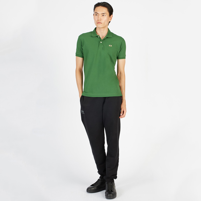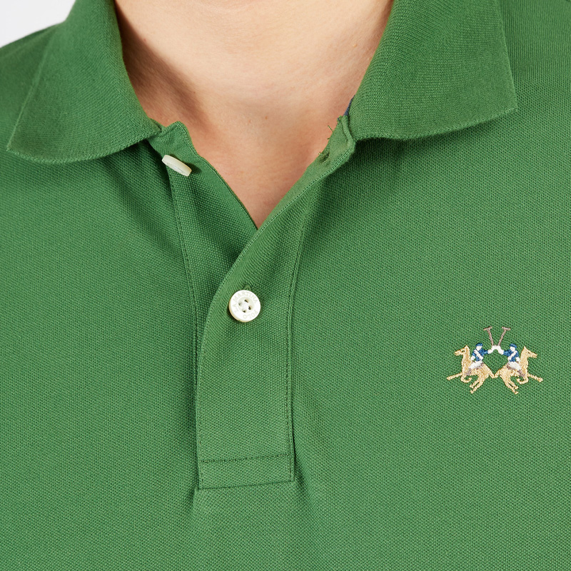 Σύνθεση: 95% βαμβάκι – 5% ελαστάνη Χρώμα: Πράσινο Στενή εφαρμογή Στρογγυλή λαιμόκοψη με γιακά και κουμπιά Κανονικό μήκος Κεντημένο το λογότυπο