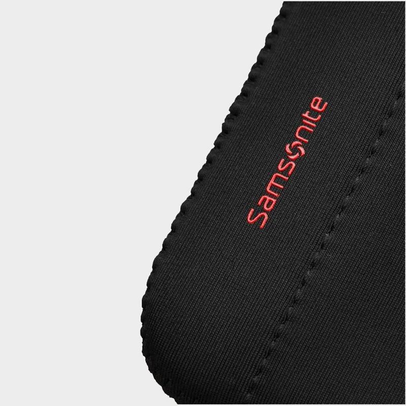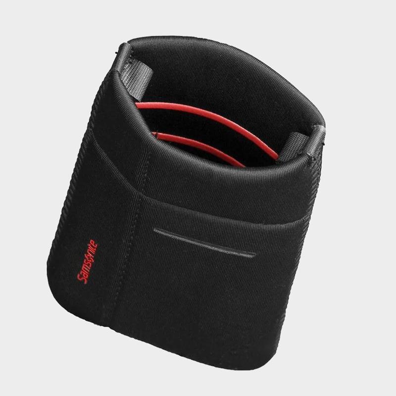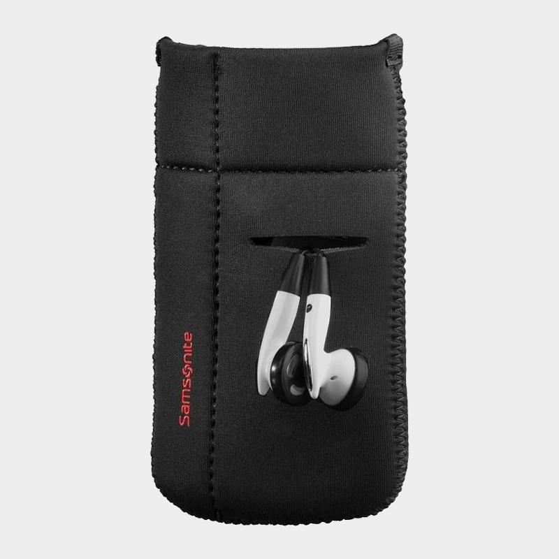 Θήκη κινητού Samsonite σε μαύρο χρώμα με κόκκινες λεπτομέρειες. Από μαλακό και ανθεκτικό συνθετικό ύφασμα, με ειδική θήκη για ακουστικά hands free.