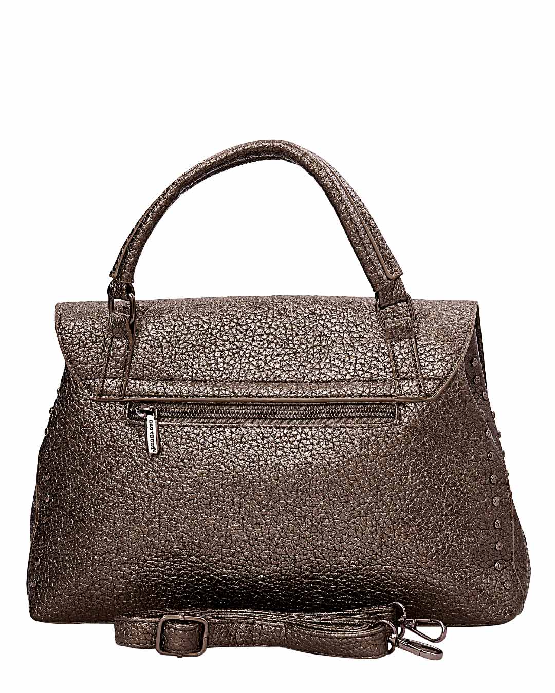 Τσάντα χειρός από υψηλής ποιότητας τεχνόδερμα.Αποτελείται από έναν κύριο χώρο που κλείνει με φερμουάρκαι καπάκι που διαθέτει περίτεχνο κούμπωμα.Εσωτερικά διαθέτει στην μπροστινή όψη βοηθητικές θήκες καιπίσω όψη βοηθητική θήκη με φερμουάρ.Εξωτερικά διαθέτει στην πίσω όψη τσέπη που κλείνει με φερμουάρ.Διαθέτει ρυθμιζόμενο-αποσπώμενο λουράκι!