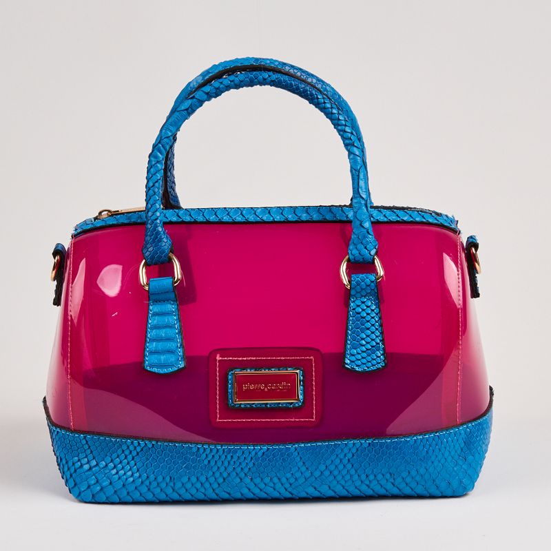 Μια εντυπωσιακή τσάντα της Pierre Cardin με διπλή απόχρωση ροζ και μπλε τύπου μπακουλάκι με έναν μεγάλο κεντρικό χώρο . Το ροζ τμήμα της τσάντας είναι από διάφανο pvc και το μπλε τμήμα της από σταμπωτό φίδι. Μία πανέμορφη και μοντέρνα τσάντα που δεν πρέπει να λείπει από καμιά ντουλάπα. Διαθέτει λουράκι για να κρεμαστεί στον ώμο αλλά και χιαστί.
