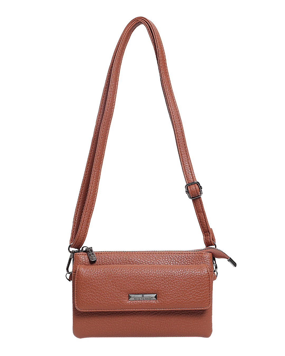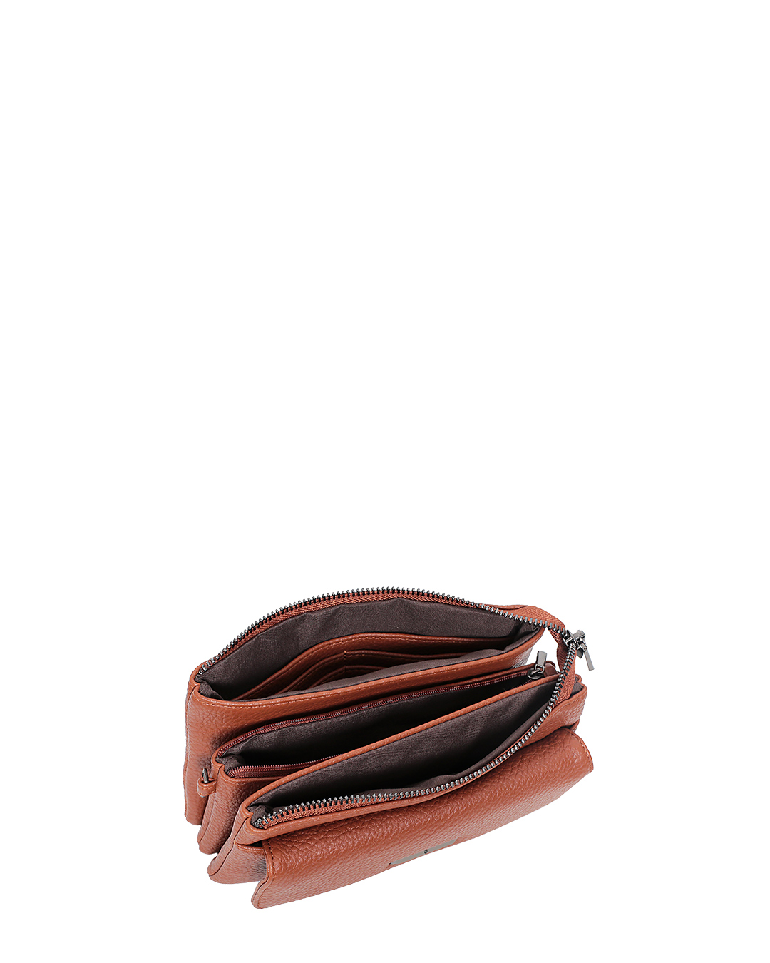 Τσάντα χιαστί από υψηλής ποιότητας τεχνόδερμα.Αποτελείται από δύο κύριους χώρους που κλείνουν με φερμουάρ.Διαθέτει βοηθητική τσέπη στην μπροστινή όψη που κλείνει με καπάκι.Επίσης διαθέτει αποσπώμενο-ρυθμιζόμενο λουράκι.
