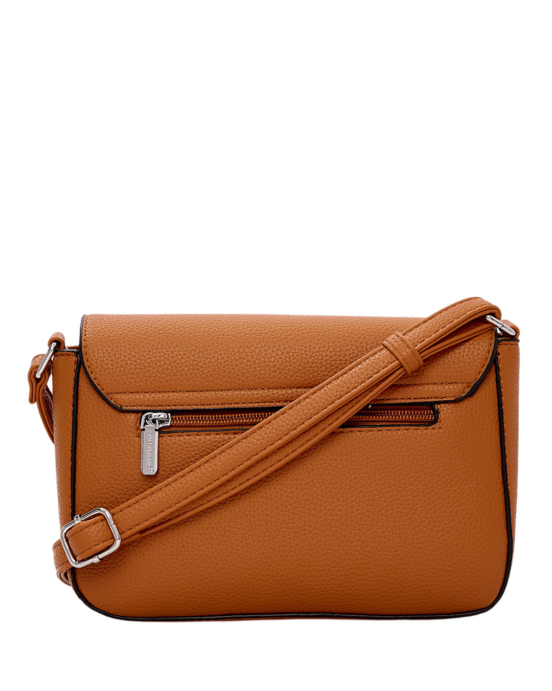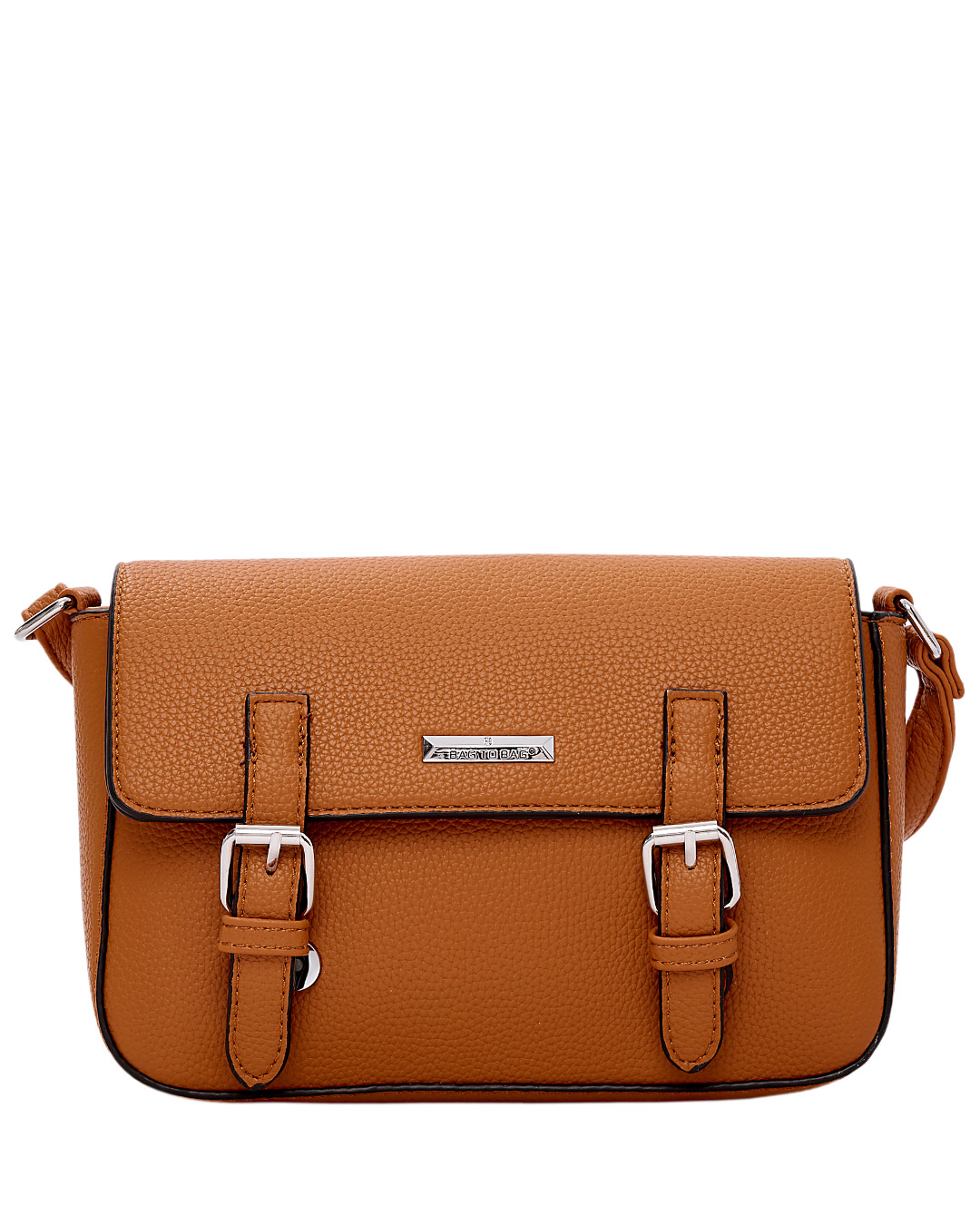 Τσάντα χιαστή από υψηλής ποιότητας τεχνόδερμα.Αποτελείται από έναν κύριο χώρο που κλείνει με φερμουαρκαι καπάκι το οποίο διαθέτει περίτεχνa κοyμπώματα.Διαθέτει στην πίσω όψη βοηθητική τσέπη που κλείνει με φερμουάρ.Διαθέτει ρυθμιζόμενο λουράκι.