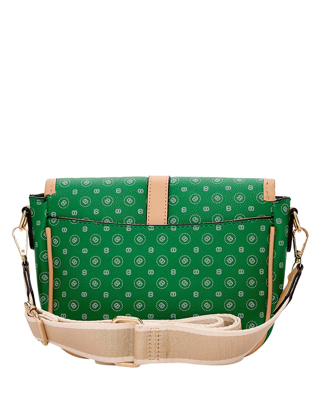 Τσάντα χιαστί από υψηλής ποιότητας τεχνόδερμα.Αποτελείται από έναν κύριο χώρο που κλείνει με φερμουάρκαι καπάκι το οποίο διαθέτει περίτεχνο κούμπωμα.Επίσης διαθέτει αποσπώμενο-ρυθμιζόμενο λουράκι.