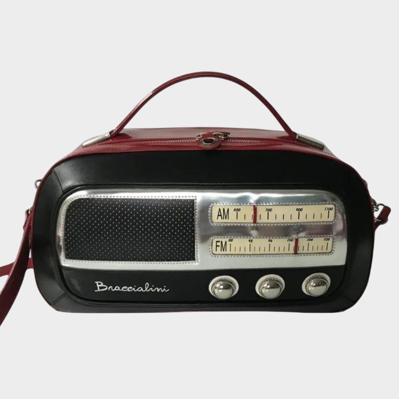 Η τσάντα σε σχήμα ραδιοφώνου Braccialini είναι ένα από τα πιο εμβληματικά και πρωτότυπα κομμάτια του οίκου μόδας της Φλωρεντίας, γνωστός για τις τολμηρές δημιουργίες και τα μοναδικά του σχέδια. Κατασκευασμένο από οικολογικό δέρμα με προσοχή στις πιο μικρές λεπτομέρειες, αναπαράγει πιστά ένα vintage ραδιόφωνο με ανάγλυφα καντράν, κουμπιά και ηχεία.