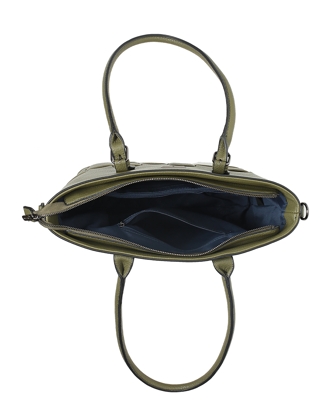 Τσάντα ώμου από υψηλής ποιότητας τεχνόδερμα.Αποτελείται από έναν κύριο χώρο που κλείνει με φερμουάρ.Εσωτερικά διαθέτει στην μπροστινή όψη βοηθητικές θήκες καιπίσω όψη βοηθητική θήκη με φερμουάρ.Εξωτερικα διαθέτει στην στην πίσω θήκη που κλείνει με φερμουάρ.Διαθέτει ρυθμιζόμενο-αποσπώμενο λουράκι !