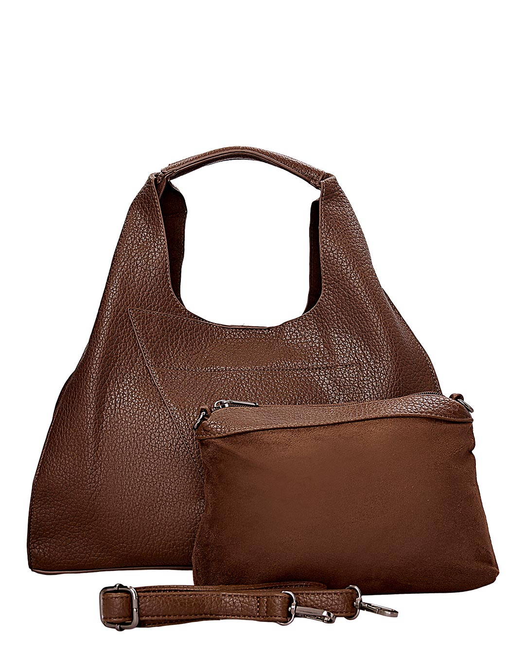 Τσάντα ώμου από υψηλής ποιότητας τεχνόδερμα.Αποτελείται από έναν κύριο χώρο που κλείνει με φερμουάρ.Εσωτερικά διαθέτει στην μπροστινή όψη θήκη με φερμουάρκαι στην πίσω όψη βοηθητική τσέπη που κλείνει με φερμουάρ.Επισης διαθέτει μικρό τσαντάκι-νεσεσερ που κλείνει με φερμουαρ μεδιαστάσεις 15Υx24Μx6ΠΔιαθέτει ρυθμιζόμενο-αποσπώμενο λουράκι.
