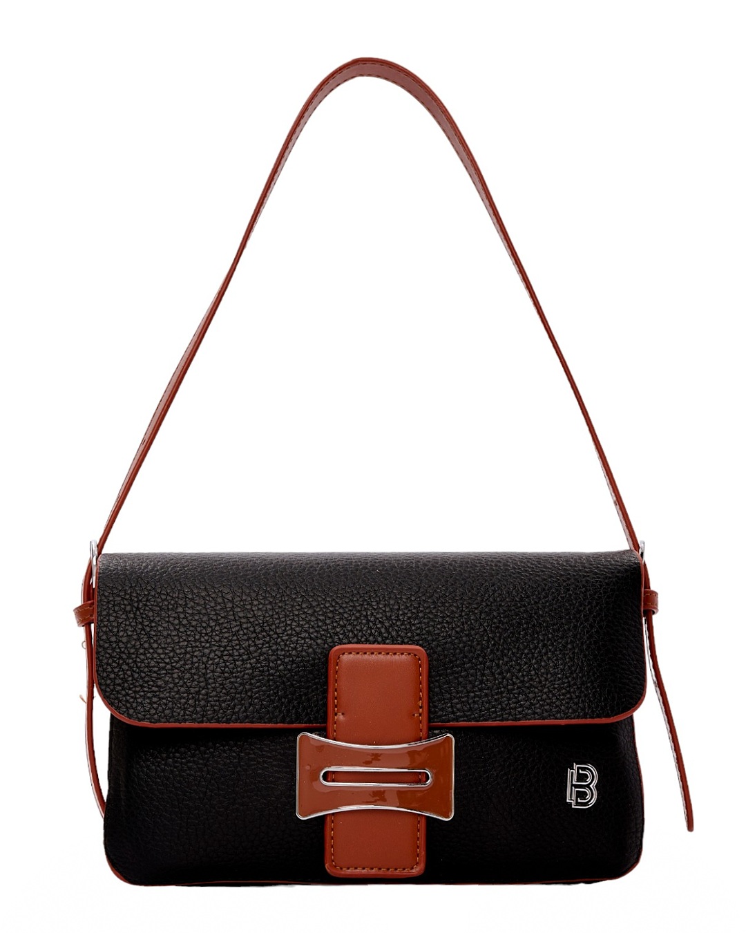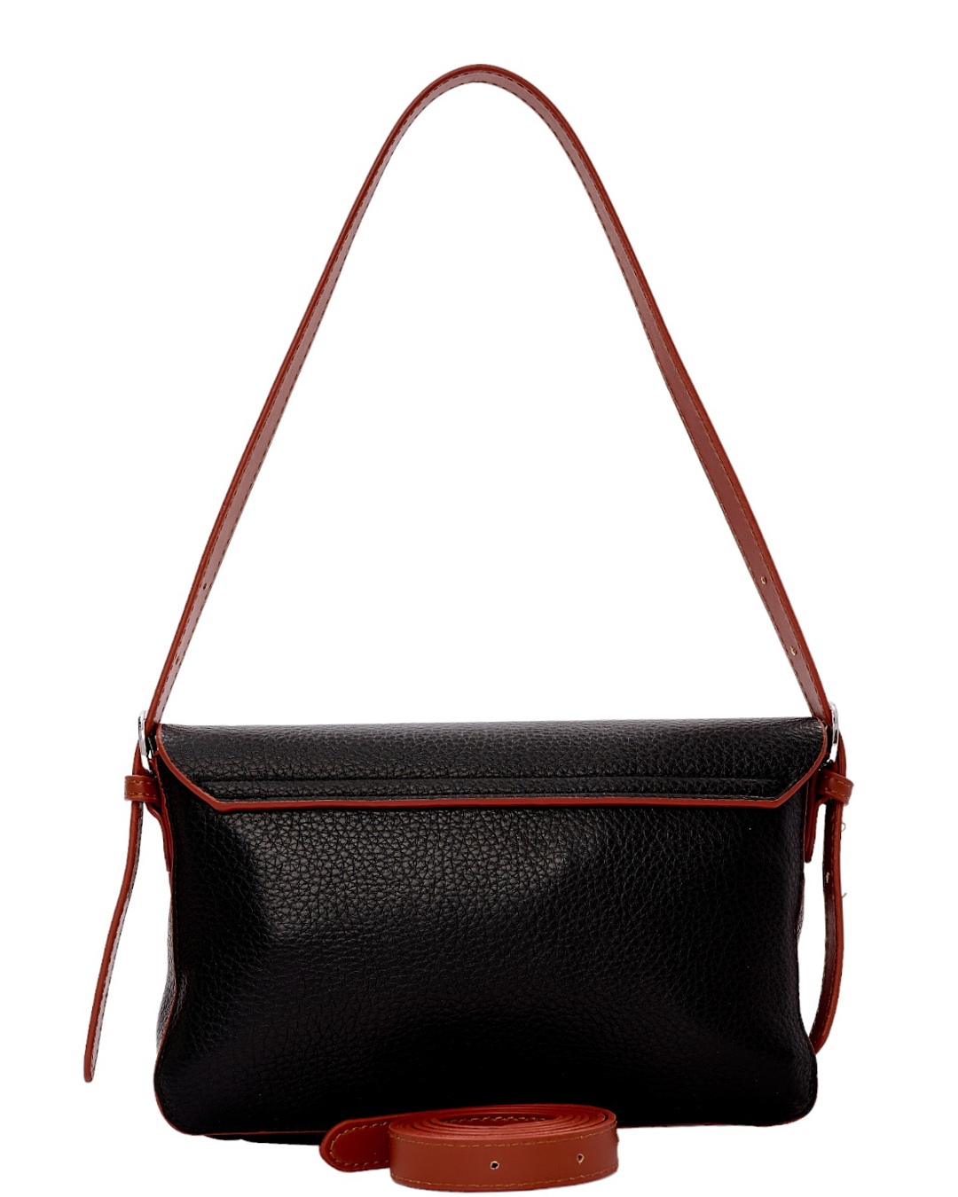 Τσάντα ώμου από υψηλής ποιότητας τεχνόδερμα.Αποτελείται από έναν κύριο χώρο που κλείνει με φερμουάρ κ έπειτα με καπάκι που διαθέτει περίτεχνο κούμπωμα.Εσωτερικά διαθέτει στην εμπρός κ πίσω όψη βοηθητικές θήκες.Επίσης διαθέτει ρυθμιζόμενο λουράκι.