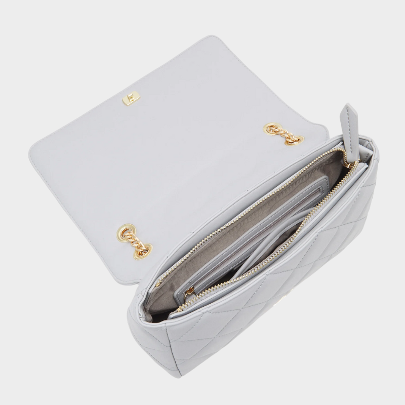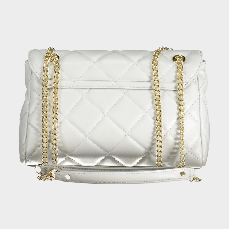Τσάντα με 2 αλυσίδες ώμου, 2 εσωτερικές τσέπες, αντίθετα στοιχεία, κλείσιμο με φερμουάρ και κουμπί, λογότυπο.