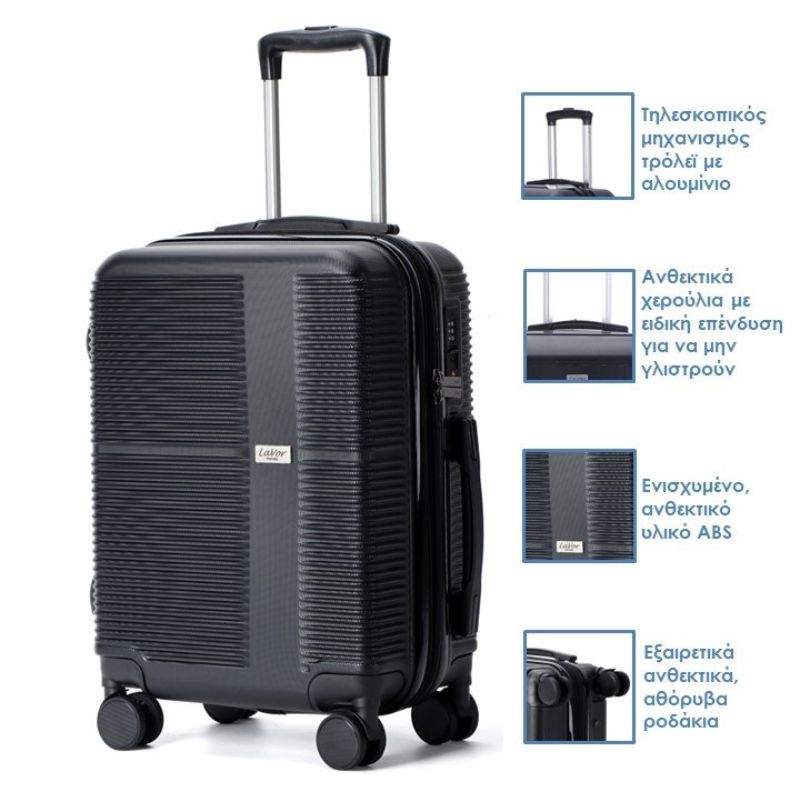 Μικρή σκληρή βαλίτσα καμπίνας της LAVOR κατασκευασμένη από ενισχυμένο εύκαμπτο ABS με σαγρέ επιφάνεια της, ώστε να είναι ανθεκτική σε γρατσουνιές και χτυπήματα.